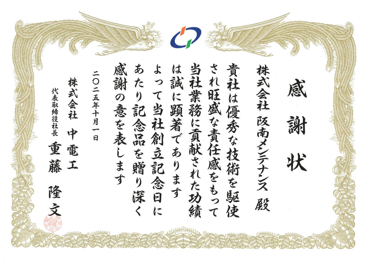 株式会社中電工創立記念式典が大阪市北区の中電工大阪本部にて午前9時30分よりおこなわれ、当社代表取締役佐竹宏之が参加させていただきました。弊社は協力会社として感謝の意を表していただき感謝状ならびに記念品を賜りました。